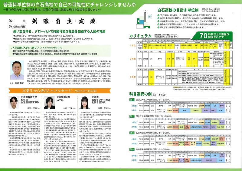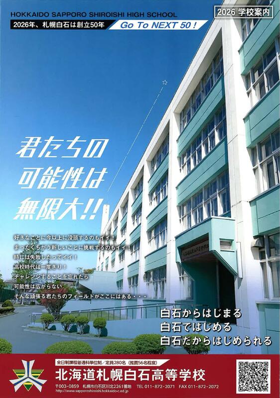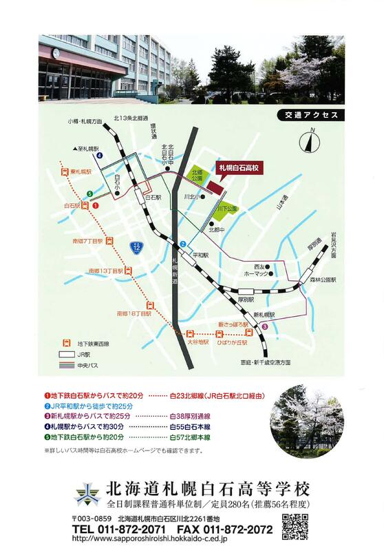 北海道札幌白石高等学校(全日制課程普通科単位制) 〒003-0859 北海道札幌市白石区川北2261番地 TEL 011-872-2071 FAX 011-872-2072